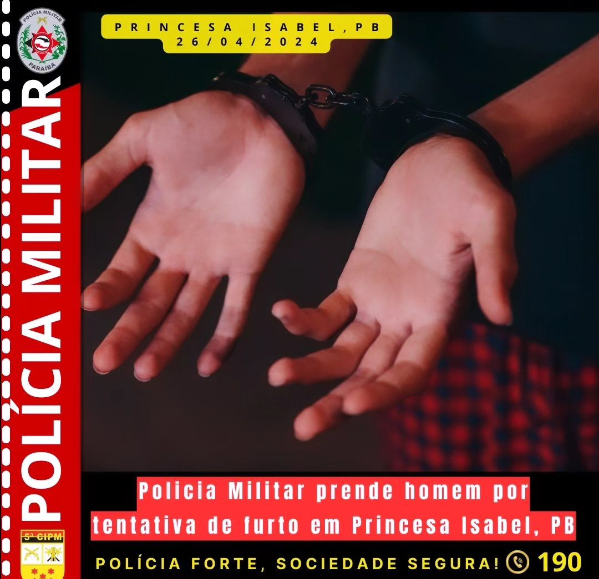 Na tarde de hoje, sexta-feira (26) de abril de 2024, a Polícia Militar, prendeu um homem por tentativa de furto em Princesa Isabel, no Sertão da Paraíba...